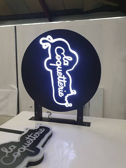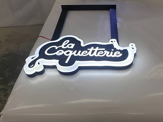 | Enseignes & panneaux | Caissons, enseigne perpendiculaire et drapeaux lumineux sur mesure en forme à Lyon et Villeurbanne