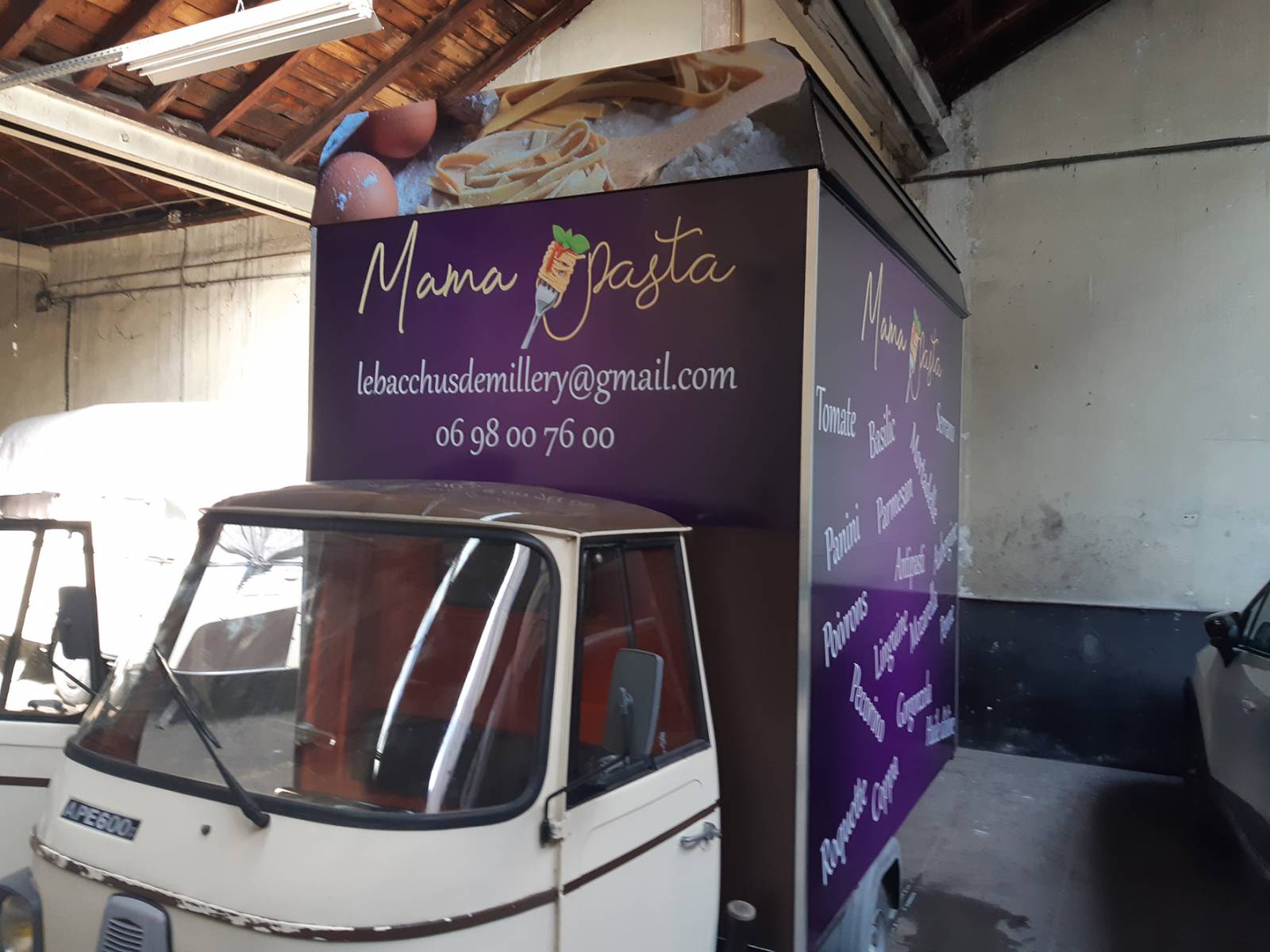 Pour Mama Pasta, le flocage a été réaliser en adhésif (imprimé plastifié anti UV), spécialement utilisé pour le marquage de véhicule